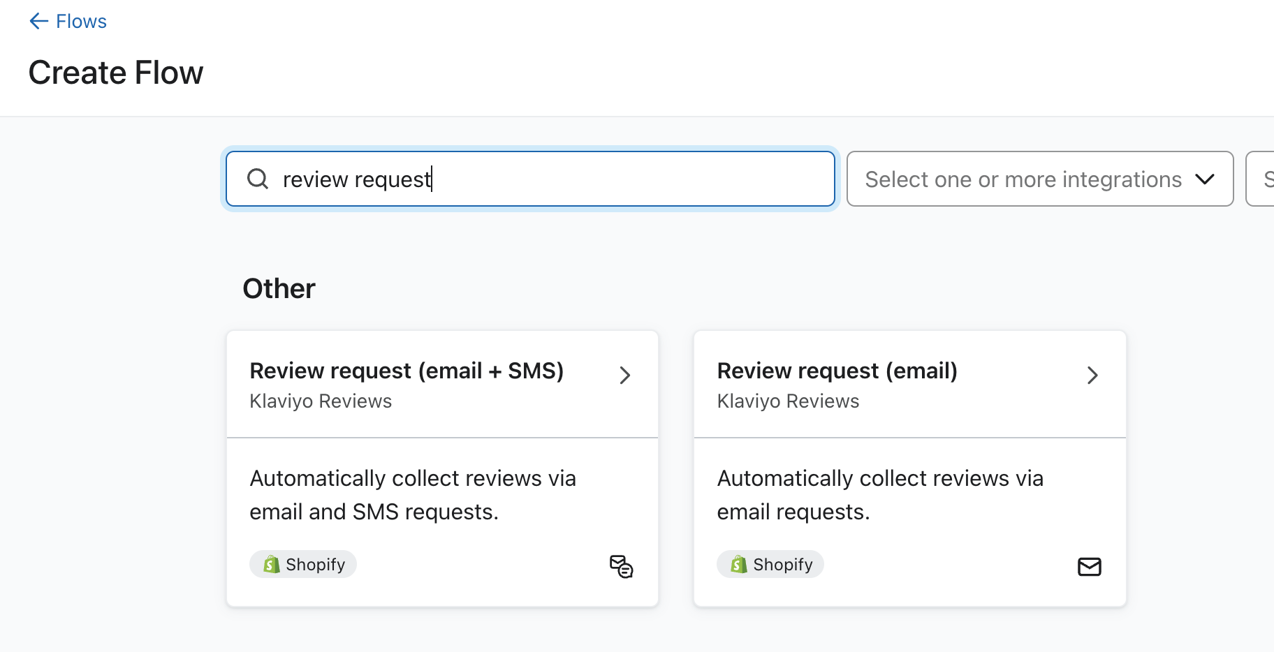 - Search for “Review request,” then select one of the Review Request: Klaviyo Reviews cards.
