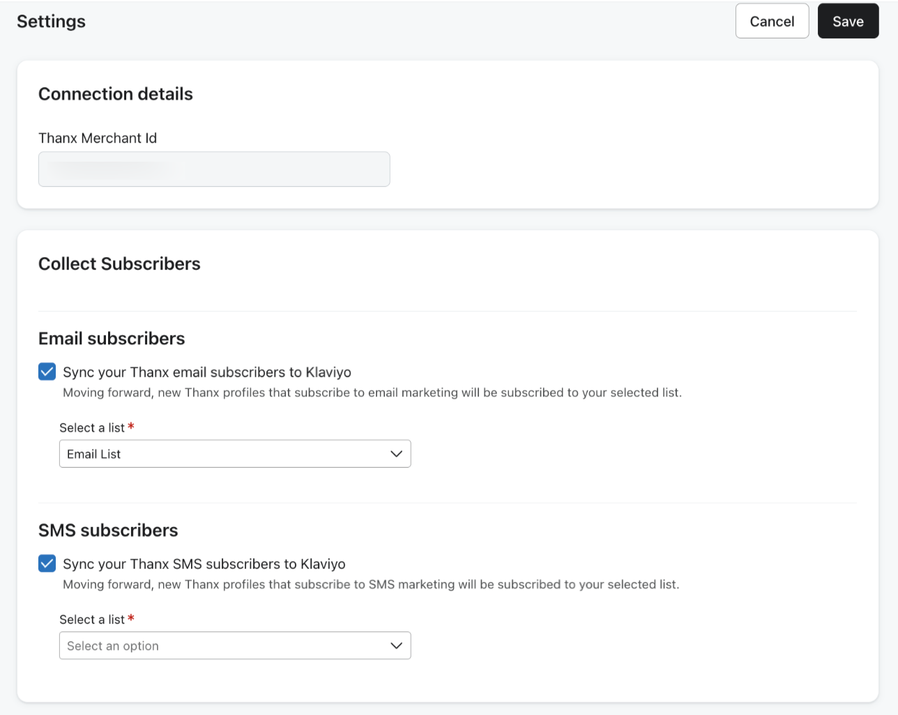 - Check the box to sync Thanx SMS subscribers to Klaviyo, and select a list from the dropdown. We recommend keeping separate lists for email and SMS subscribers.