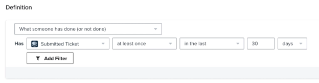 - Under Definition, select What someone has done (or not done) > Submitted Ticket > at least once > in the last > 30 > days.
