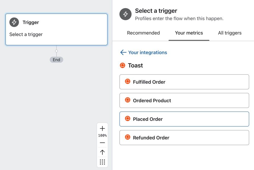 You can use Toast metrics to trigger flows. For example, you can use the Placed Order metric to trigger a flow to send messages to someone immediately when they place an order.