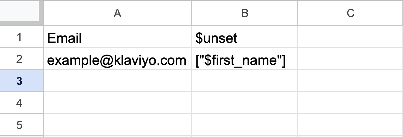 To unset a native Klaviyo property, add the prefix $. For example, to unset the Klaviyo property city, use $city in your CSV file.