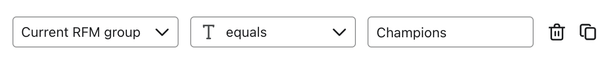 In this example, Current RFM group is the property being referenced in the condition, and the property value is Champions. You can replace Champions with the RFM group you are targeting.