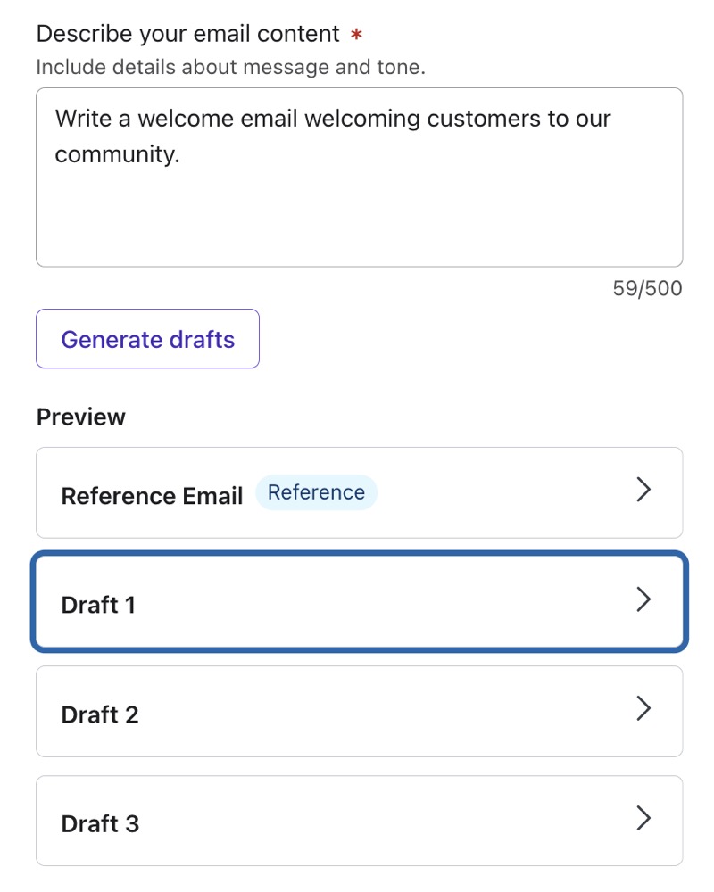 - If one of the drafts is close to what you want, select it and click Open in editor in the top right to enter the email template editor. Edit the generated content as desired.
