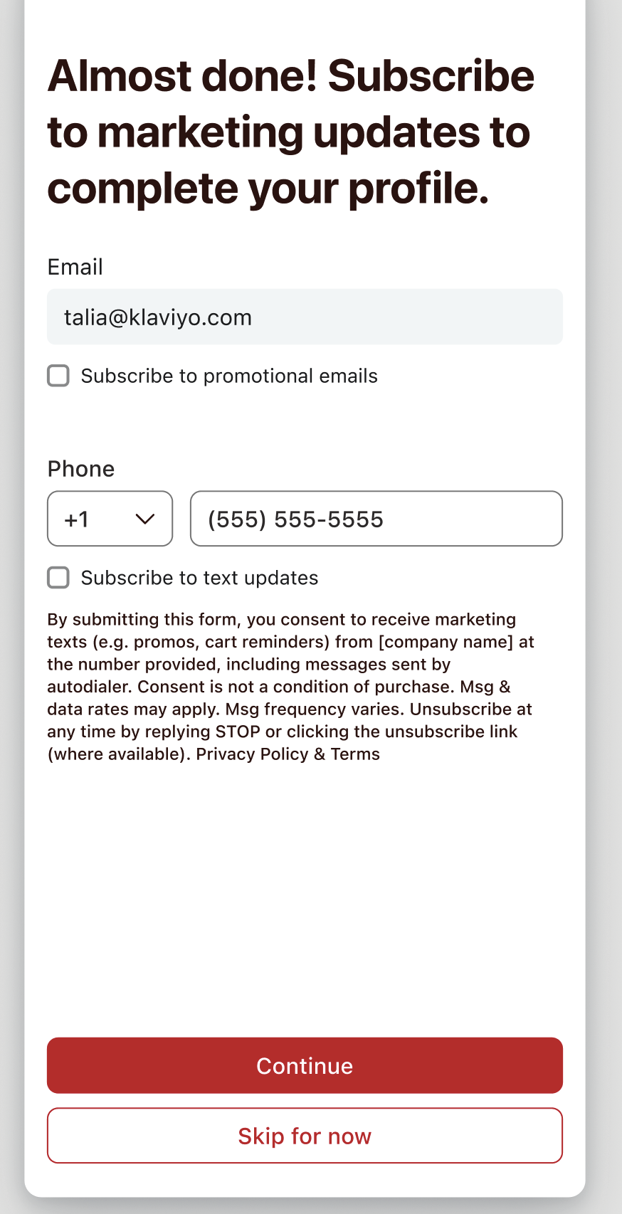 Email consent is a nuanced topic. While SMS consent is explicitly required before sending any marketing messages, email consent is not always required. To understand what's right for your brand, refer to: