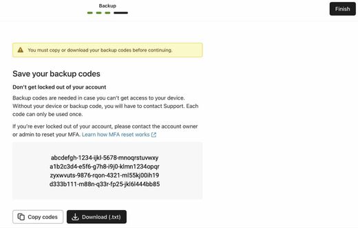 - On the next page, you’ll see 4 random backup codes; click either Copy codes or Download (.txt).