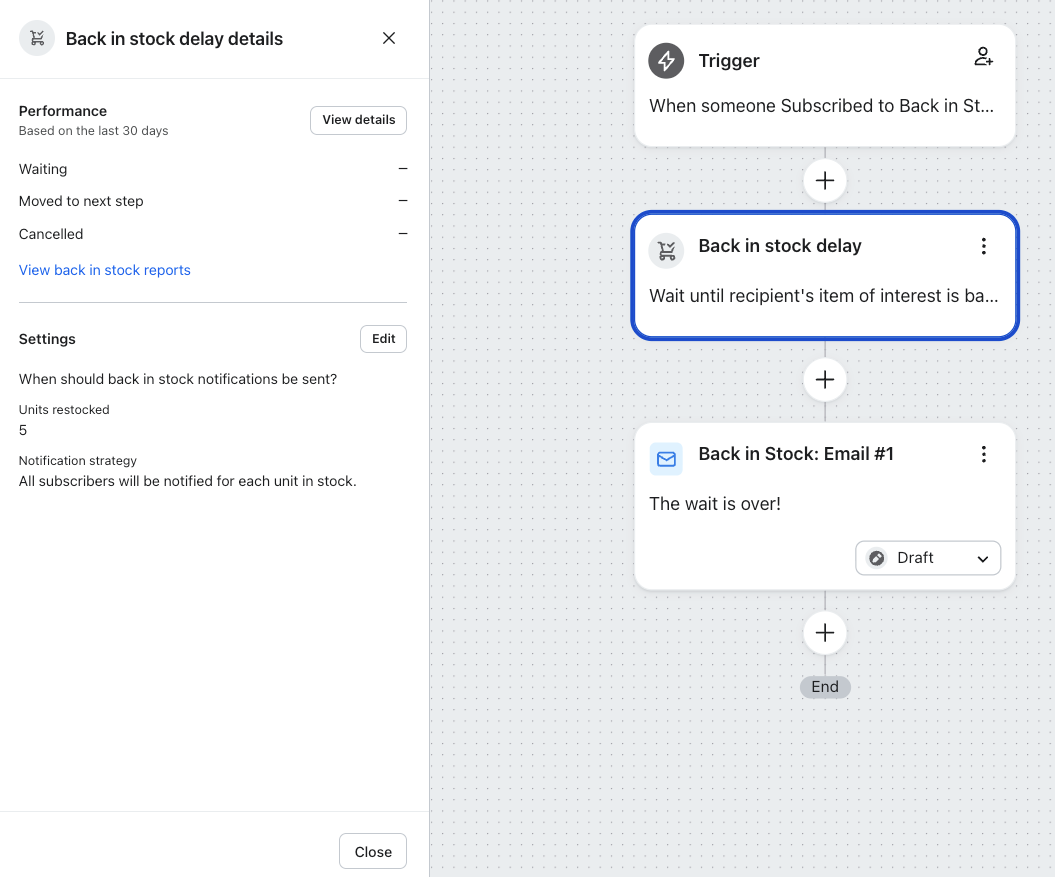 Learn about how back in stock flows work, how contacts move through them, and how they appear different from most other metric-triggered flows. For instance, they have the back in stock delay component, which is unique to this type of flow.