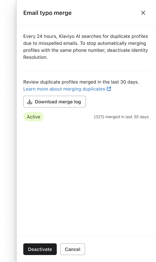 Once activated, you’ll see an Active status for the transformation on the Identity resolution tab. By clicking into an active transformation, you can download a log of merges within the past 30 days using the Download merge log button or disable the transformation by selecting the Deactivate button.
