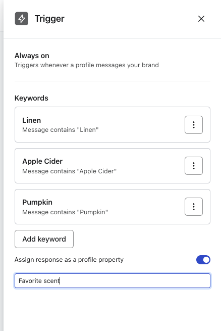8. Optional, but highly recommended: to set profile properties based on the keyword trigger, toggle on the Assign responses as a profile property option.