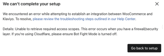 This message means that either your firewall is blocking Klaviyo’s requests, that you have Bot Fight Mode enabled in Cloudflare, or both.