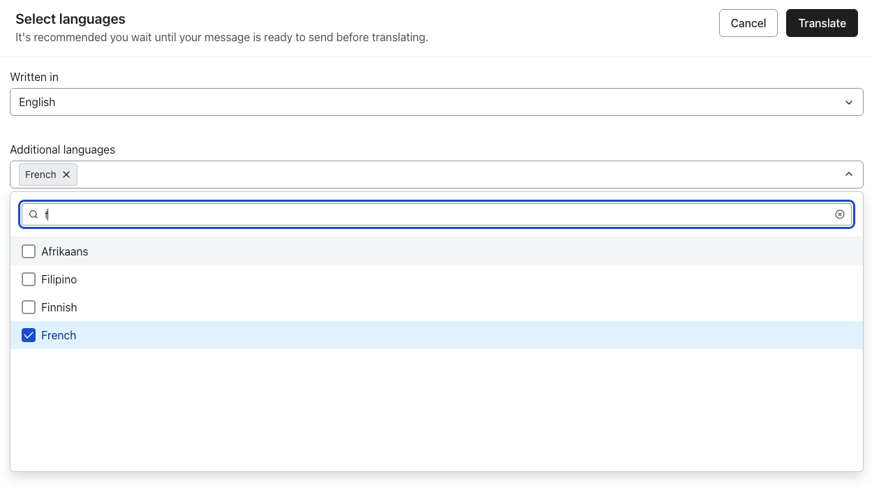 - Select what languages you want to translate your campaign into by selecting them from the Additional languages dropdown.