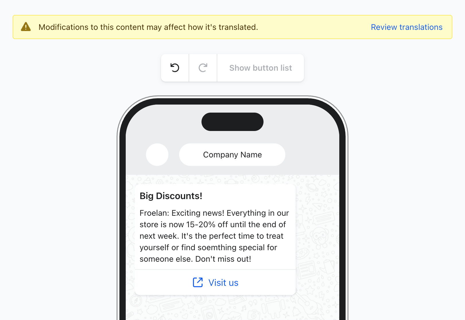 Keep in mind that WhatsApp messages and their translations need to be reviewed by Meta before being marked as approved, so make sure your message is fully edited and ready to send in your original language before translating it. Otherwise, you'll have to go through the translation and wait for approval again if you make edits to the original content.