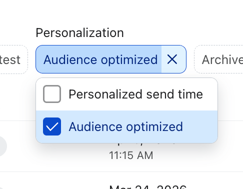 - You can also use the filters in the campaign list to view only campaigns that used Audience Optimization.