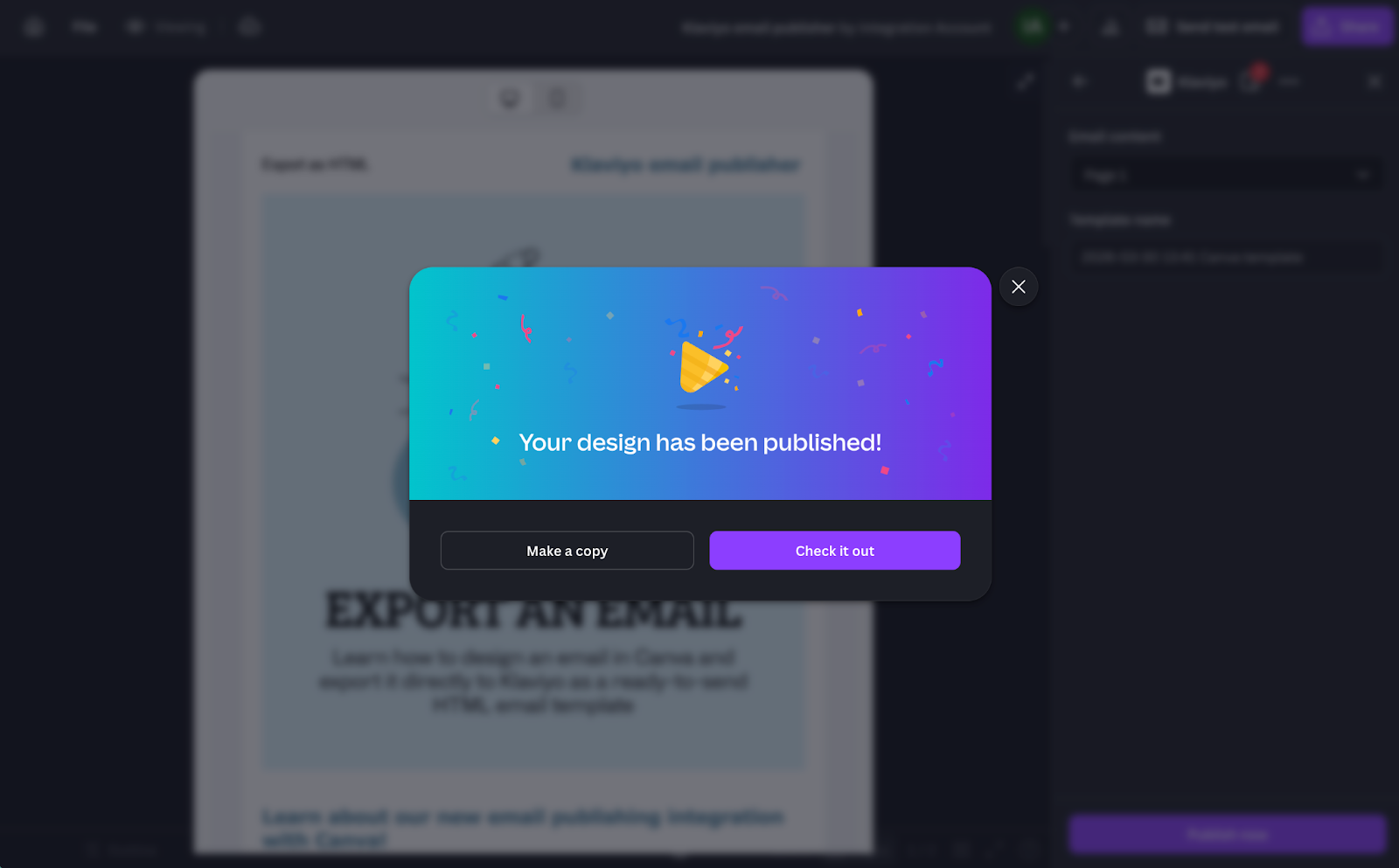 - Click Publish now. Canva will prepare your design as an HTML email template and send it to Klaviyo.