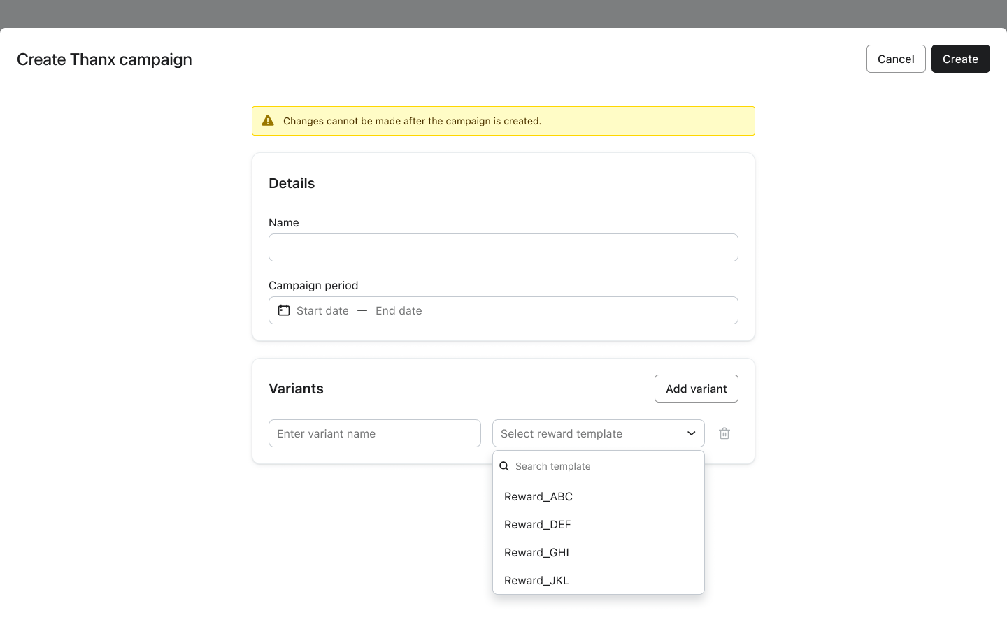 - Create a new Thanx campaign within Klaviyo and enter the Name, Campaign period, and Variants you would like to associate with your campaign.