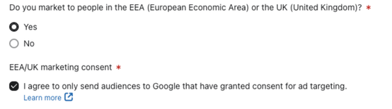 - If you market to people in the EEA or UK, in compliance with the Digital Markets Act, you must agree to only send audiences to Google that have granted consent to ad targeting.