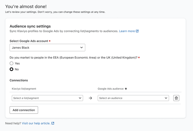 - If you want to add additional connections, click Add Connection. Note that you can return to this settings page at any time to add additional connections. Additionally, note that this is a 1:1 sync; you cannot select the same Google Audience for multiple Klaviyo lists or segments, and you cannot connect the same Klaviyo list or segment to multiple Google Audiences.