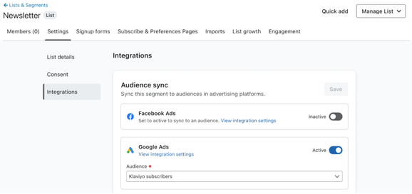 - You’ll be brought to the Integrations tab found within the list or segment’s Settings tab.