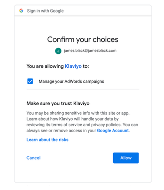- Agree to the permissions and click Allow to be brought back into Klaviyo.