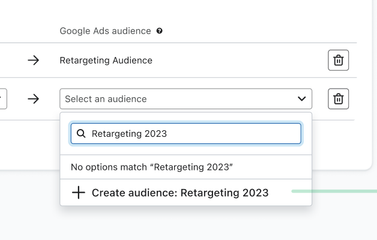 - Select a Google Audience to connect with your list or segment. If you need to create a new Google Audience, type the new name in the search box and click + Create audience: [Audience Name].