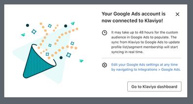 - A success message will appear, letting you know that your Google Ads account is now connected to Klaviyo.