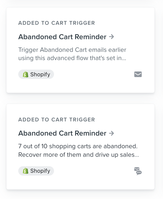 - Selecciona un flujo Activador de «Añadido al Carrito», Recordatorio de carrito abandonado. Hay dos opciones: solo correo electrónico, o correo electrónico y SMS.