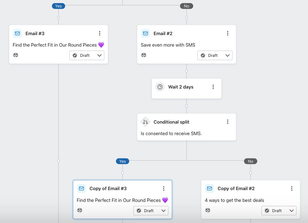 Es importante mantener separados los flujos de bienvenida por correo electrónico y SMS. Sin embargo, puede utilizar su flujo de correo electrónico para animar a la gente a suscribirse a los SMS.