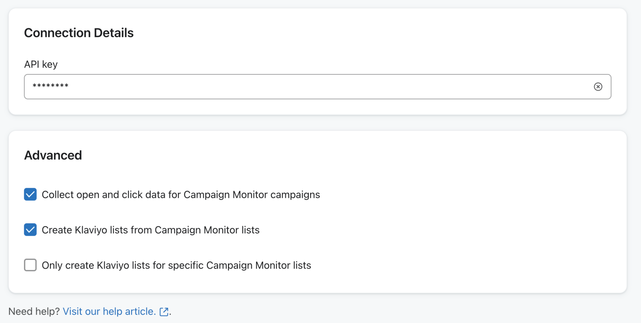 Una vez que hayas completado la configuración, los datos comenzarán a sincronizarse con Klaviyo en unos minutos. Klaviyo ejecuta una sincronización histórica, además de establecer sincronizaciones periódicas para obtener nuevos datos. Klaviyo recibe datos históricos de interacción de Campaign Monitor de los últimos 90 días. Los nuevos datos se sincronizan con Klaviyo cada hora.