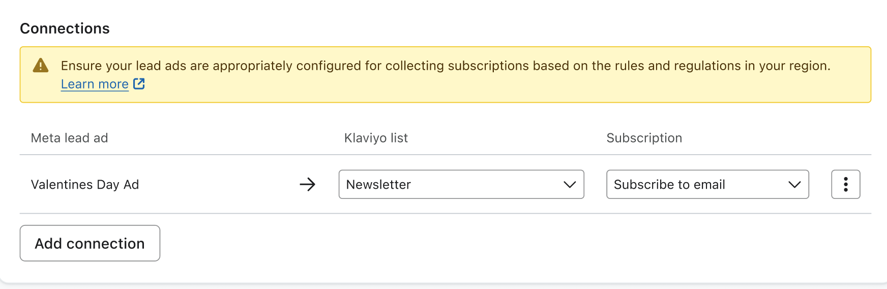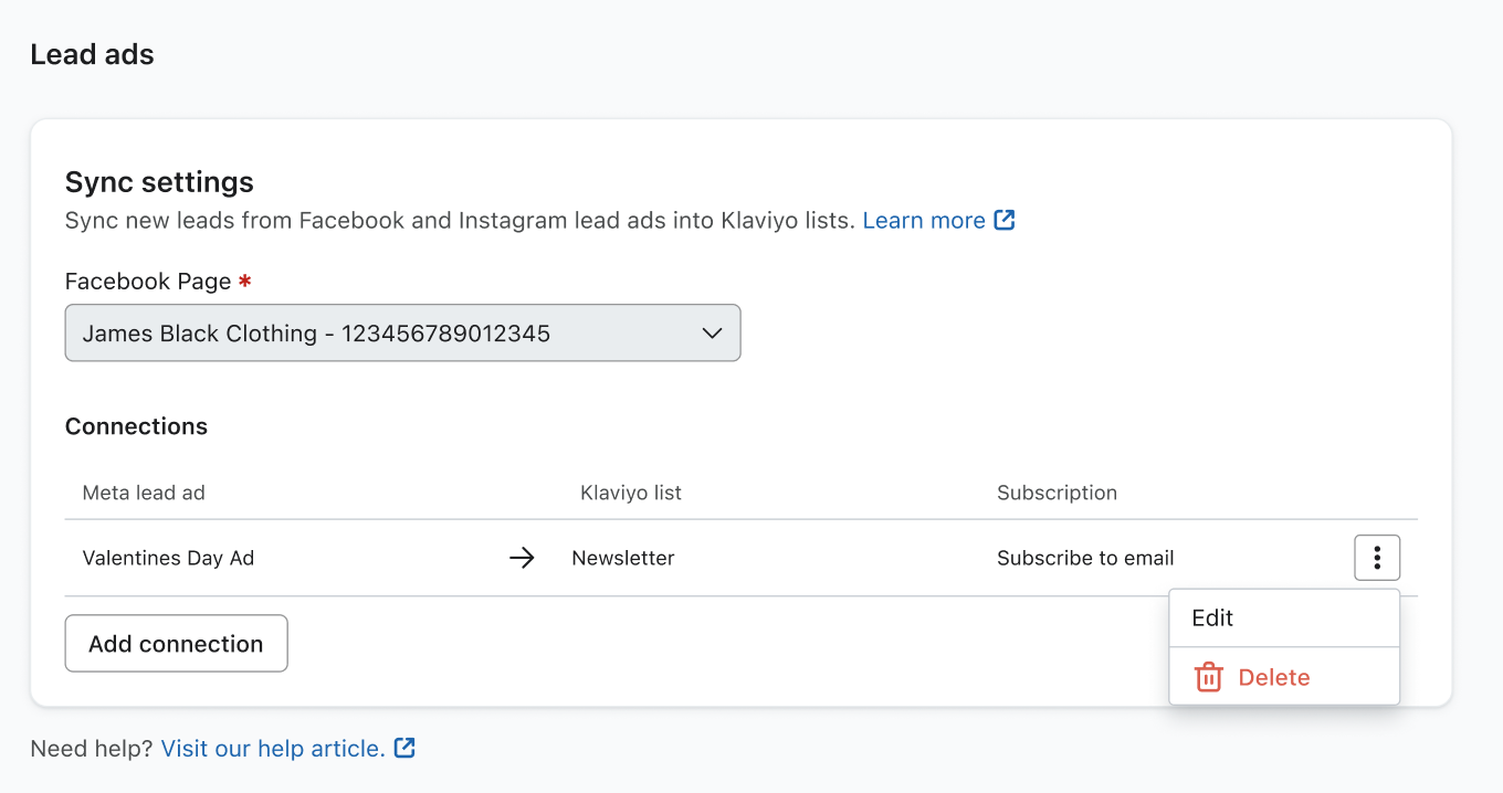 Si ha creado previamente una conexión de anuncios de clientes potenciales y desea suscribir nuevos registros en adelante, puede editar su conexión preexistente. También puede editar su conexión preexistente para cambiar su lista Klaviyo.