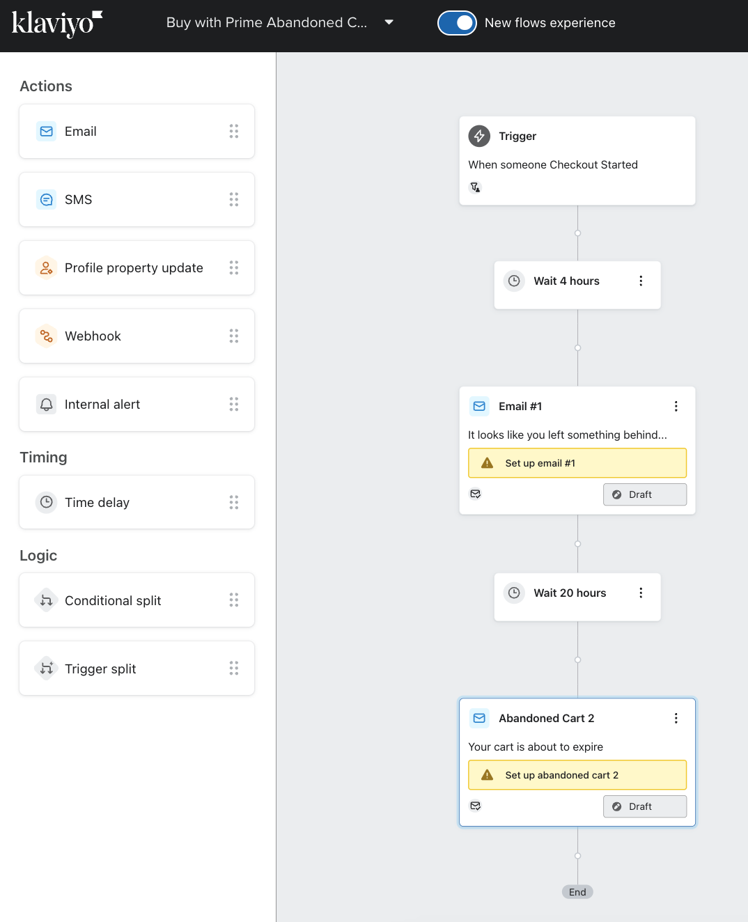 Aprenda a crear un flujo de carritos abandonados para enviar recordatorios a sus clientes de Comprar con Prime. Los flujos, también conocidos como automatizaciones o campañas de goteo, son las herramientas de Klaviyo para las comunicaciones personalizadas con sus clientes. Un flujo de carrito abandonado es un mensaje o secuencia de mensajes enviados a alguien que ha añadido un artículo a su carrito de la compra, pero no ha completado la compra.