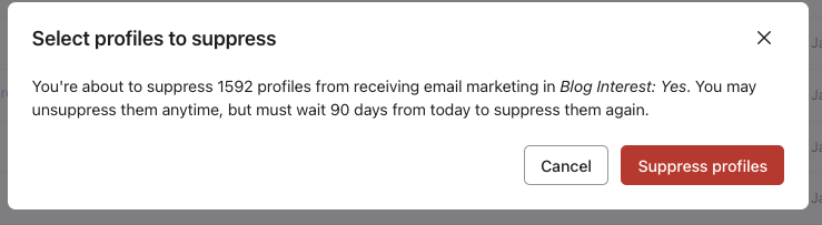 Descubre cómo suprimir un grupo de perfiles en Klaviyo de forma masiva, eliminar supresiones de forma masiva o eliminar perfiles de forma masiva, y cómo la ventana modal de supresión te ayuda a evitar suprimir perfiles activos recientemente y de alta intención de compra.