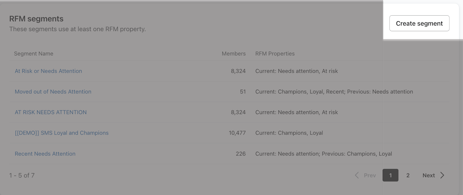 - Desplázate hasta encontrar la ficha RFM segmento y haz clic en Crear segmento.