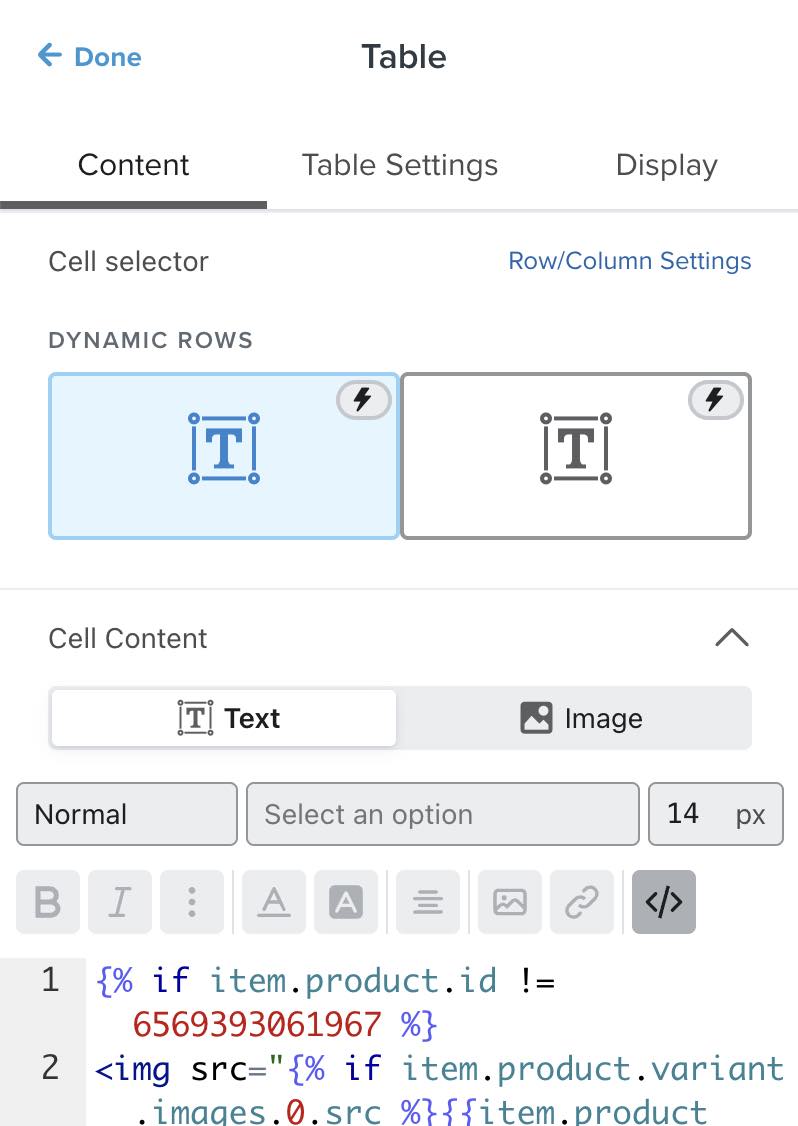 Aprenda a omitir filas (por ejemplo, elementos) en un bloque de tabla dinámica. El caso de uso más común para esto es ocultar elementos irrelevantes, como seguros de envío o artículos de regalo, de un correo electrónico de carrito abandonado. No obstante, puede seguir estos pasos para cualquier correo electrónico que utilice un bloque de tabla dinámica.