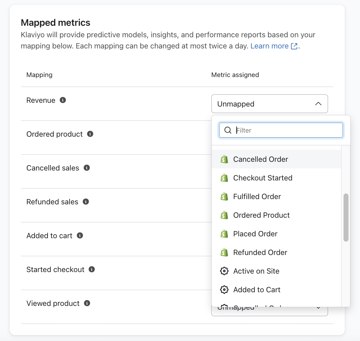 Por defecto, Klaviyo intentará mapear sus métricas automáticamente basándose en lo que se pueda detectar de sus integraciones y estructura de datos. Sin embargo, puede ajustar la métrica asignada o incluso elegir si un punto de datos concreto no tiene una métrica compatible.
