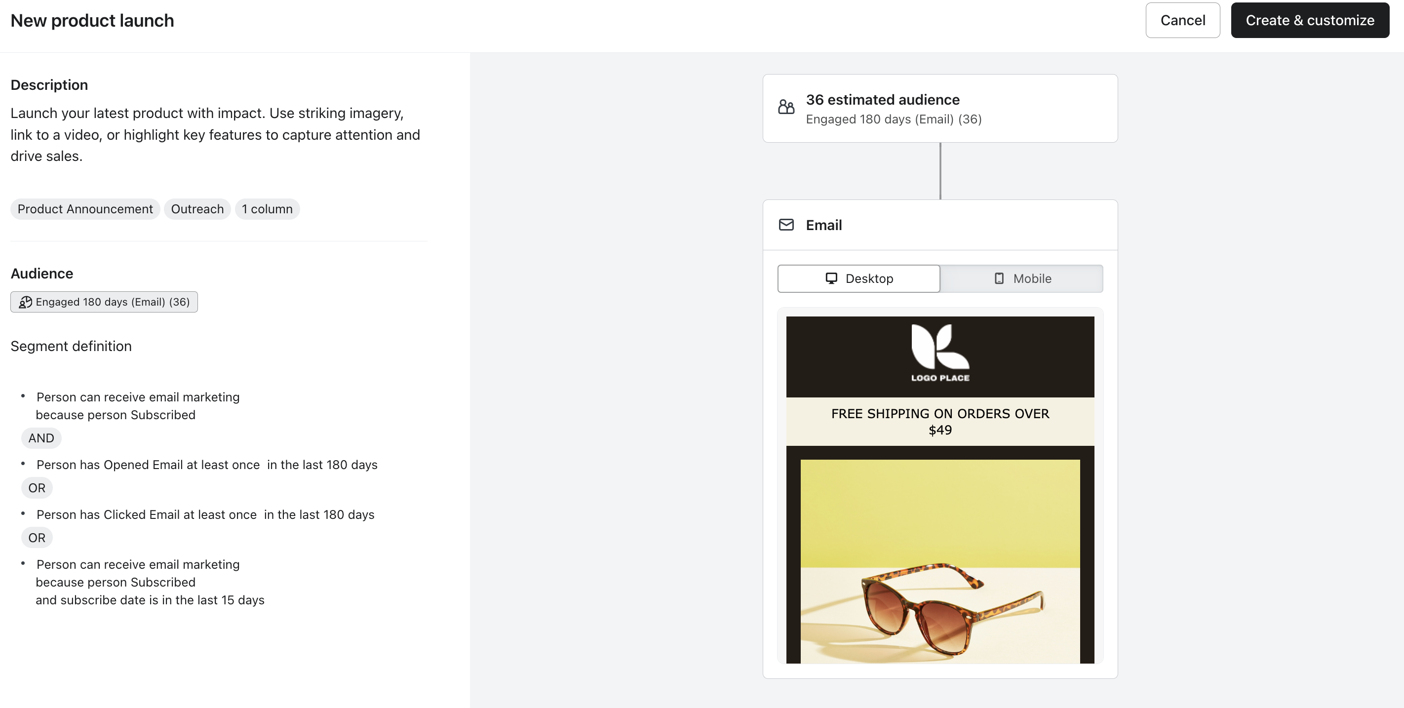 A la derecha hay una estimación del tamaño de la audiencia y una vista previa del contenido del correo electrónico utilizado en la campaña. - Haz clic en Crear & personalizar en la parte superior derecha para continuar con el asistente de configuración de la campaña.