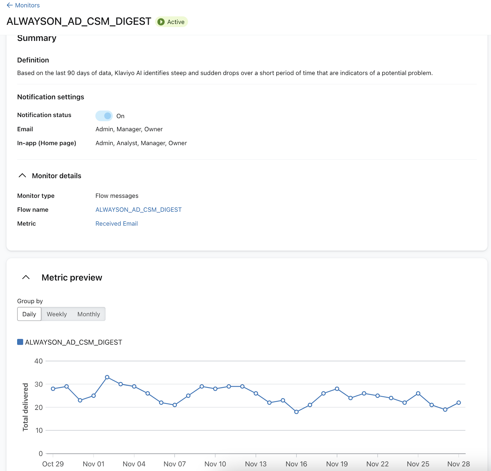 - El objeto Klaviyo con la anomalía que activó la alerta
