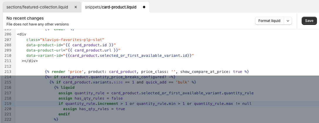 - El fragmento aparecerá probablemente en un formato similar a: {% render 'snippet-name'%}, donde "nombre-barra" es el nombre del archivo de la barra correspondiente (por ejemplo, tarjeta-producto).