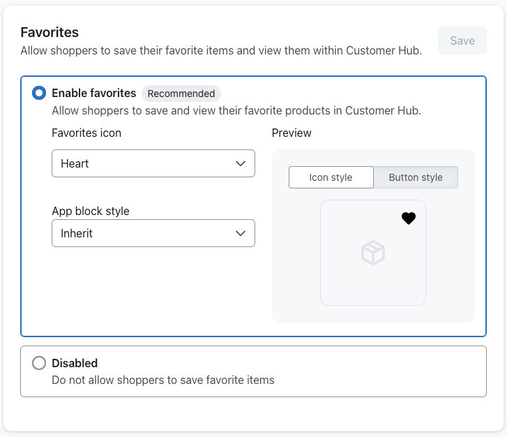 Esta guía explica cómo habilitar la configuración de Favoritos desde la configuración de Klaviyo Customer Hub en Klaviyo, y añadir botones de favoritos en diferentes páginas de tu sitio web. Antes de continuar, asegúrate de que las funciones de Klaviyo Customer Hub están habilitadas en Klaviyo.
