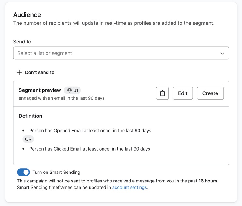 Si decides crear el segmento, aparecerá en el campo Enviar a o No enviar a para que lo utilices en tu campaña. Puedes seguir generando más segmentos o elegir la lista y el segmento existentes para añadirlos.