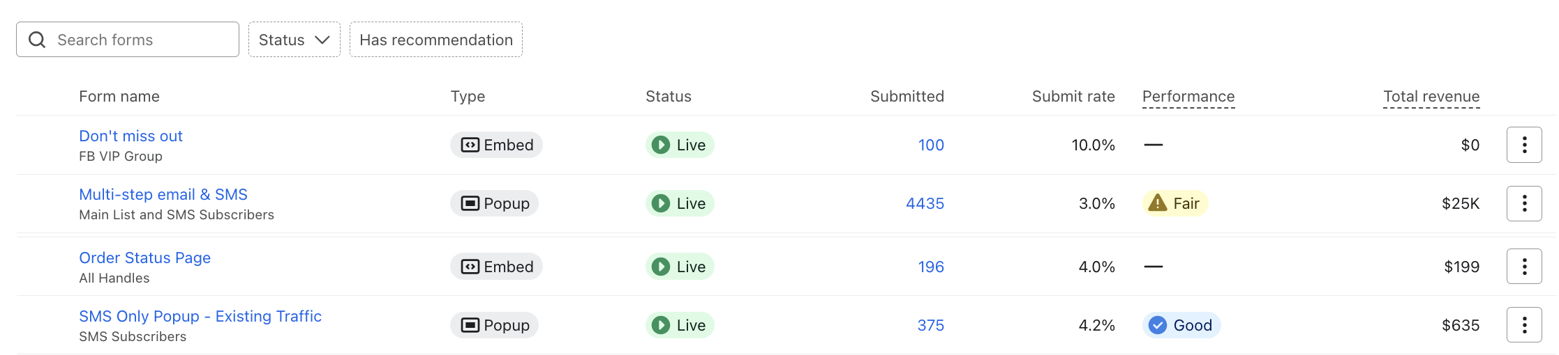 Seleccione la pestaña Formularios de inscripción en la navegación de la izquierda de Klaviyo para ver una lista de todos los formularios de su cuenta y un desglose de sus detalles y métricas clave. Tenga en cuenta que sólo verá la página de vista de lista de formularios si ha creado al menos 1 formulario de inscripción.