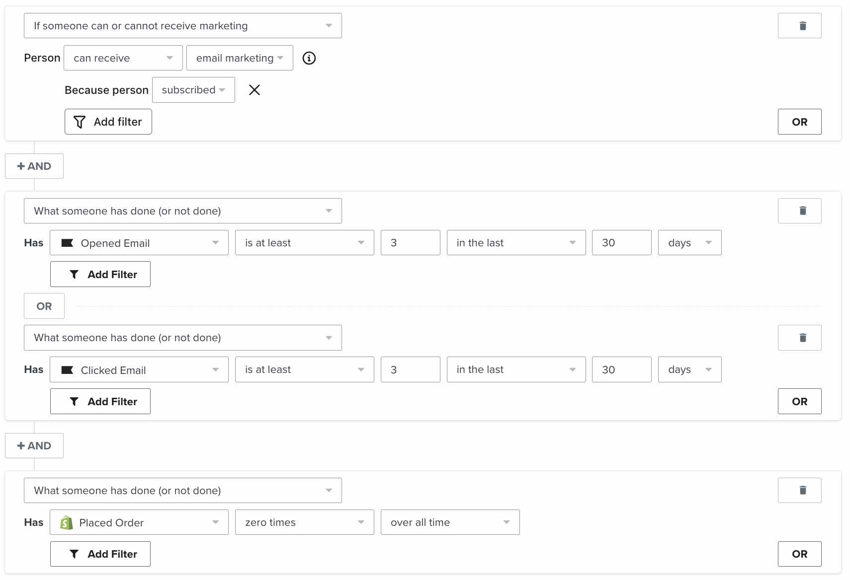 Por ejemplo, en un segmento Nearly There, tu objetivo es encontrar suscriptores que estén comprometidos pero que aún no hayan comprado en tu tienda. la interacción se define con las condiciones AND y OR, como se muestra a continuación.