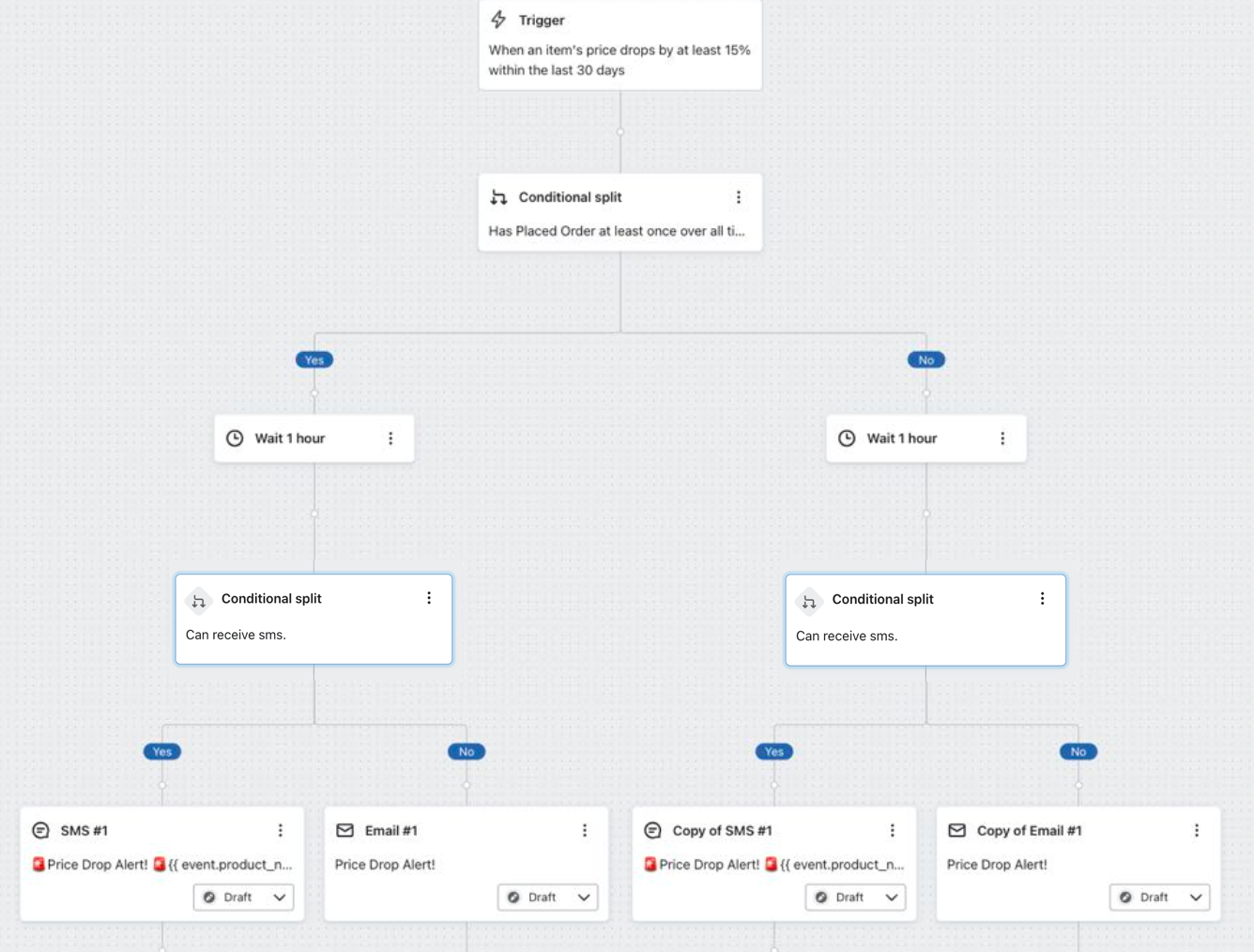 Estas condiciones se comprueban tanto al activar como antes de enviar cualquier mensaje, para garantizar que no se envían a personas que ya han comprado o solo han visto el precio más bajo. Klaviyo no incluye a nadie que haya comprado el producto después del evento de activación del flujo o que haya visto/iniciado la página de pago cuando el artículo tenía un precio más bajo.