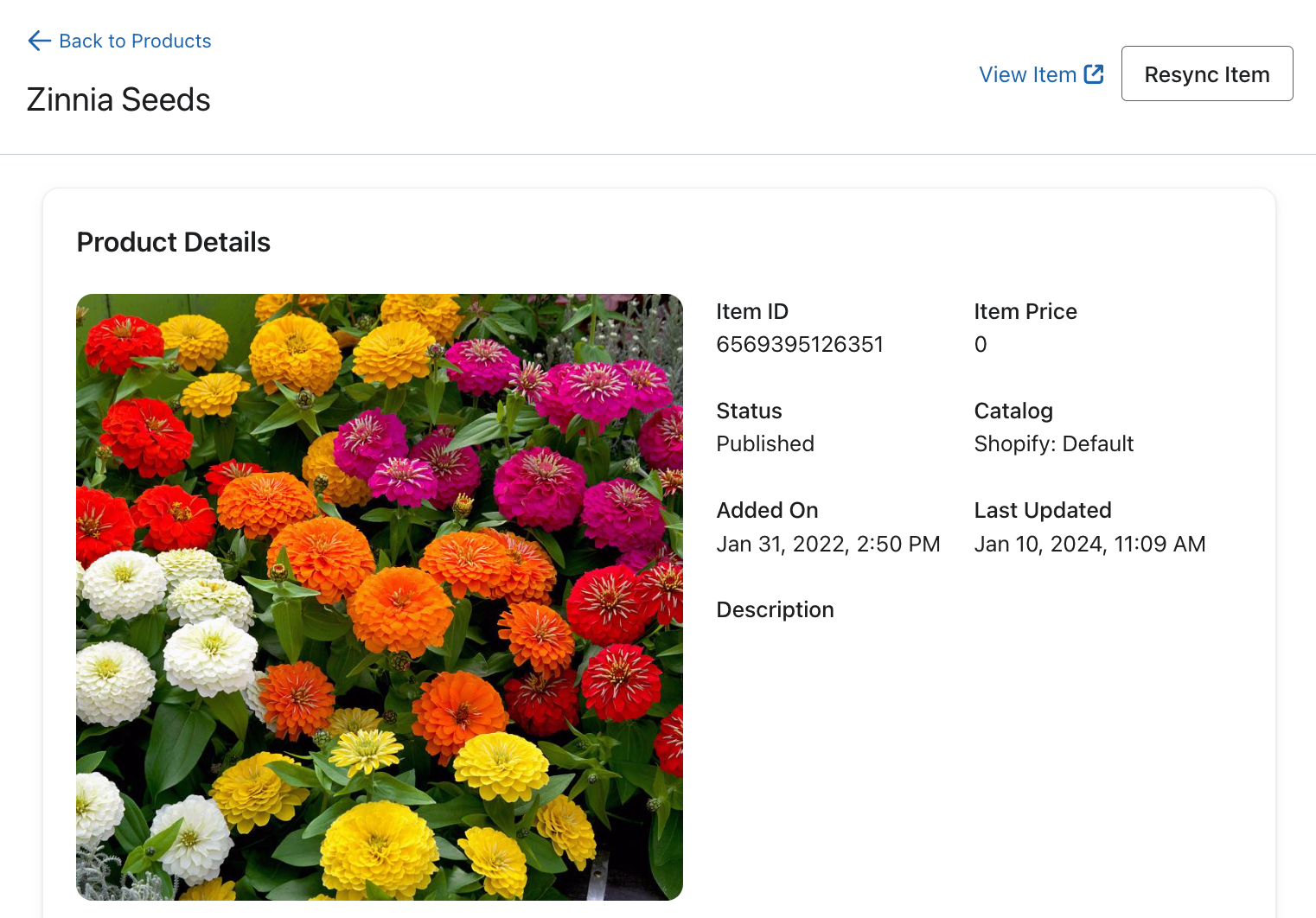 - En la página de productos, busque el artículo que desea resincronizar por su nombre o ID de artículo.
