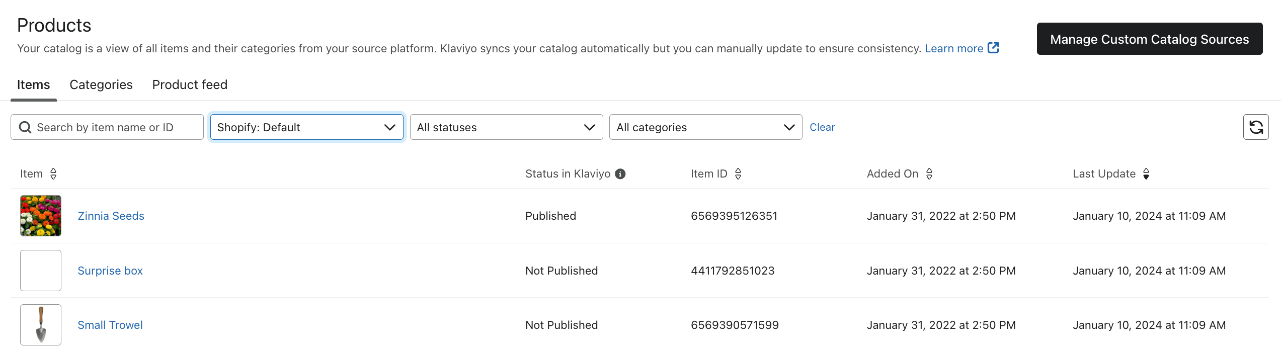 - Klaviyo sincroniza los artículos desde Shopify en tiempo real, por lo que normalmente los artículos se actualizarán sin necesidad de una resincronización.