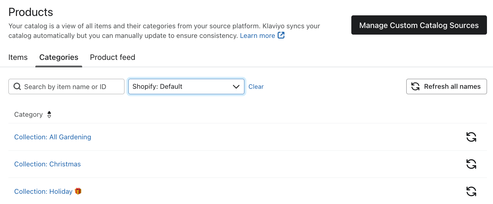 Aprende a resincronizar los artículos y categorías de tu catálogo de Shopify con Klaviyo para ver la información más actualizada. Actualmente hay 4 funciones disponibles para la resincronización del catálogo: resincronizar un artículo individual, resincronizar una página de artículos (hasta 25 artículos a la vez), actualizar los nombres de las categorías de tu catálogo y resincronizar la pertenencia de los artículos a una categoría concreta. Actualmente, la función de resincronización manual de catálogos sólo está disponible para clientes que utilicen Shopify.