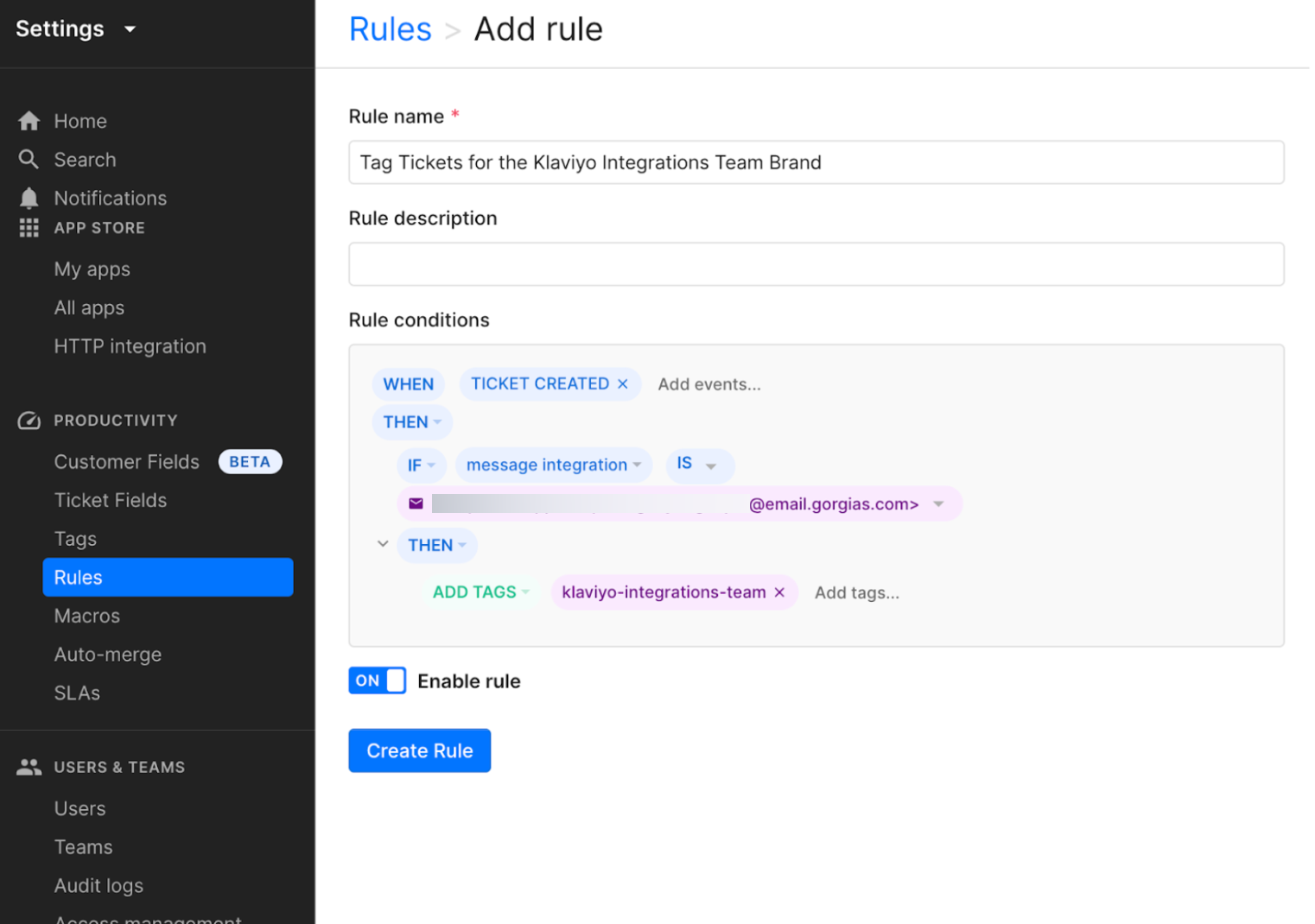 Antes de integrar Klaviyo con Gorgias, tendrás que crear una regla para cada marca para etiquetar los tickets, y opcionalmente crear una vista basada en la etiqueta de la marca, para habilitar la sincronización específica de la marca hacia y desde Klaviyo.