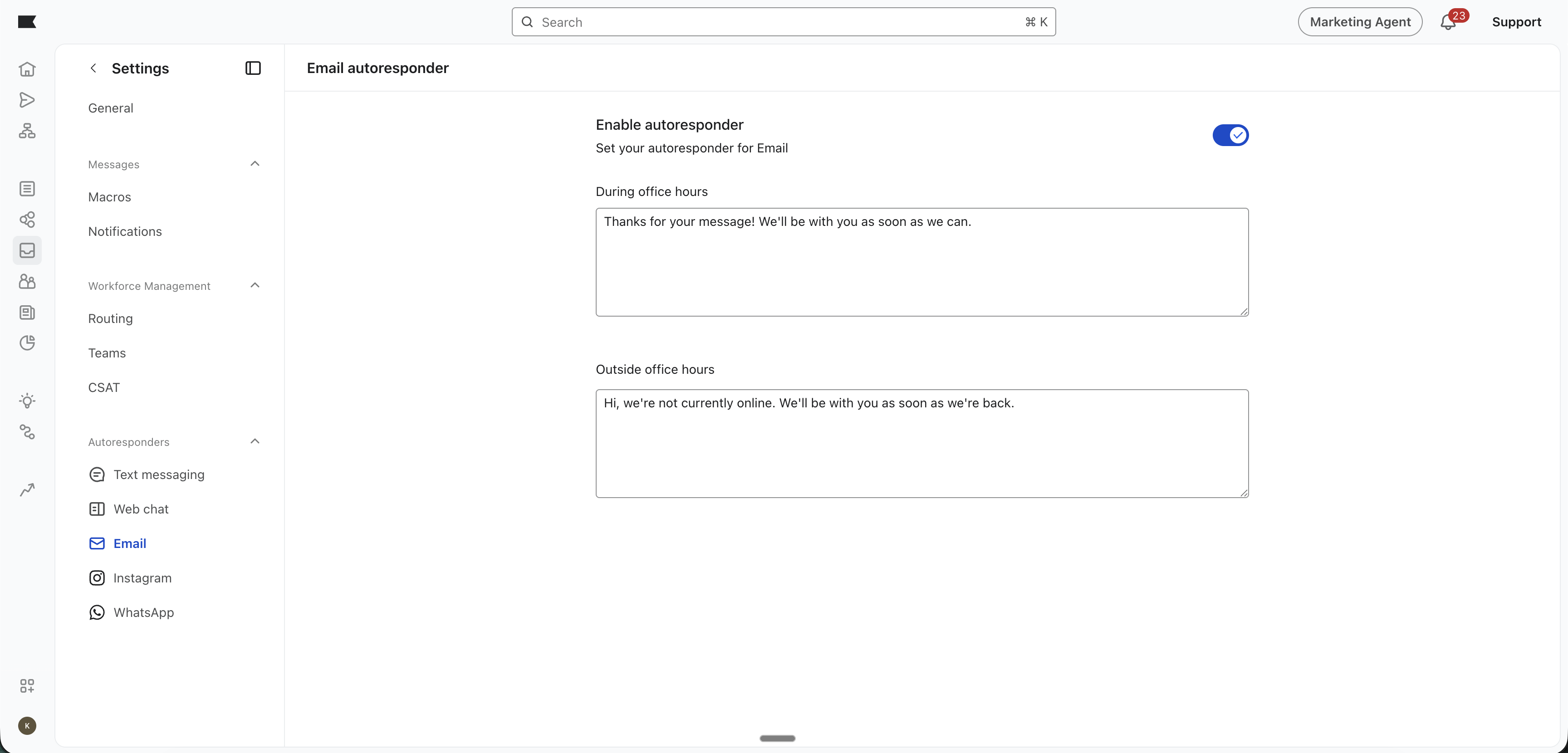 Al aprovechar las respuestas automáticas omnicanales, puedes reconocer instantáneamente las consultas de los clientes, establecer expectativas realistas sobre los tiempos de respuesta e incluso resolver consultas simples a través del autoservicio, ya sea que tu equipo esté en sus escritorios o fuera de línea durante el fin de semana.