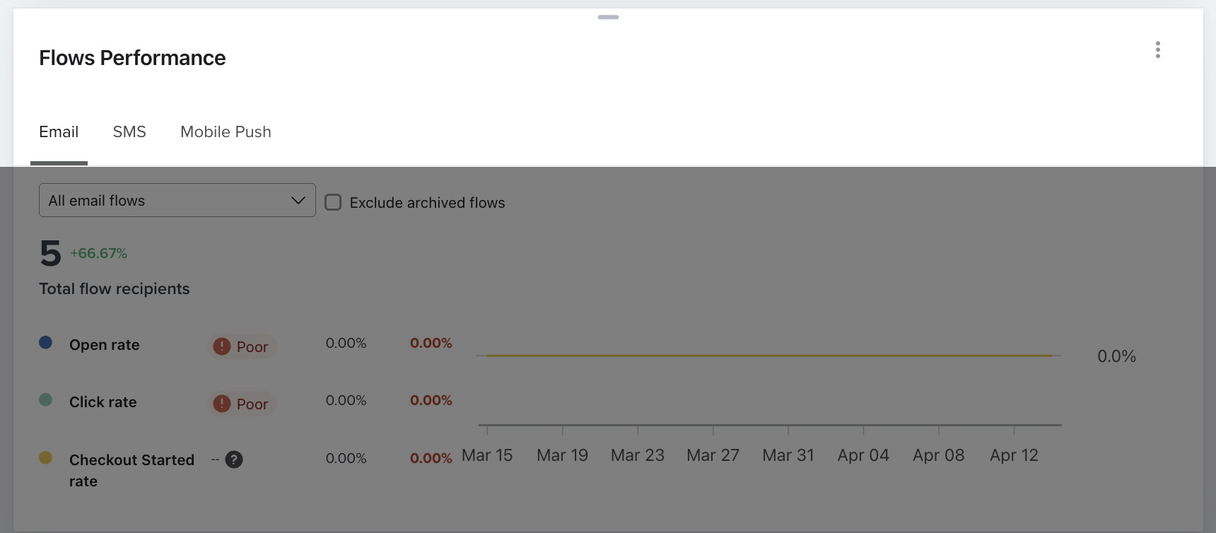 Si abres el desplegable Todo el flujo de SMScorreo electrónico, Todo el flujo de, o Todo el flujo de push móvil, puedes afinar aún más la vista viendo todo el flujo o a un flujo concreto. También puedes hacer clic en la casilla de verificación Excluir flujo en borrador, situada junto a este desplegable, para excluir de tus datos cualquier flujo que se encuentre actualmente en modo borrador.