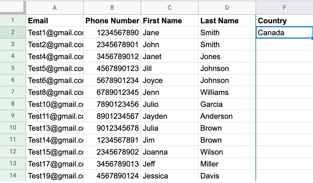 En las instrucciones que figuran a continuación, utilizamos Google Sheets para indicar el país en una carga de lista de SMS. Esto también puede lograrse utilizando otros programas, pero las instrucciones pueden diferir.