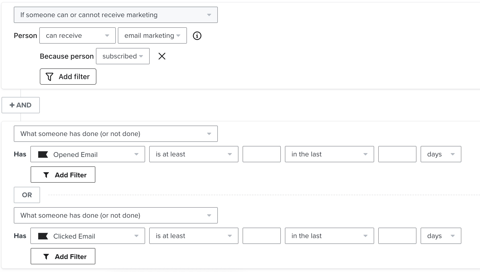 La estructura del segmento seguirá siendo la misma para todas las opciones, basada en el número de clics o aperturas dentro de la ventana de compromiso correspondiente: