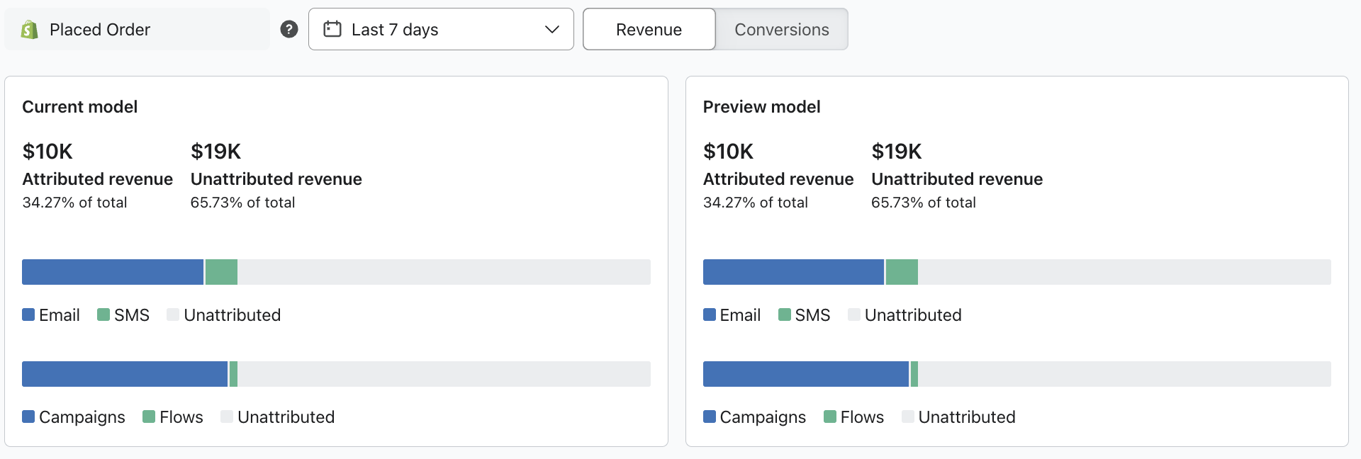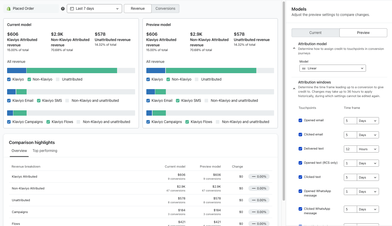 Revisa cómo se ajustan los ingresos atribuidos a Klaviyo y otros ingresos no atribuidos en cada canal de marketing. Compara esta sección con la sección Configuración actual a la izquierda para ver cómo cambia tu rendimiento cuando ajustas la configuración. -